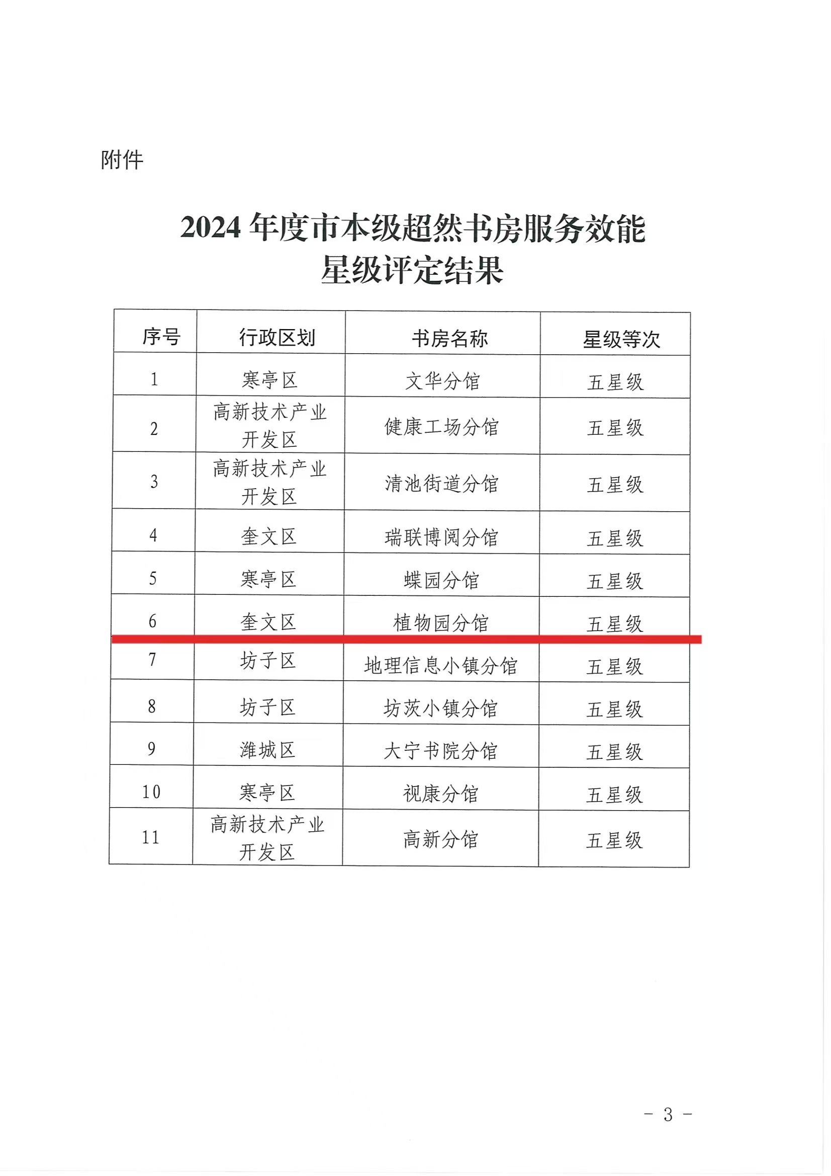 近日,在濰坊市文化和旅游局舉辦的市本級超然書房建設、運行管理及服務效能星級評定活動中,由濰坊市園林環衛集團權屬公司易興公司運營的濰坊市圖書館·植物園分館“超然書房”榮獲了2024年度服務效能五星級書房的榮譽稱號。