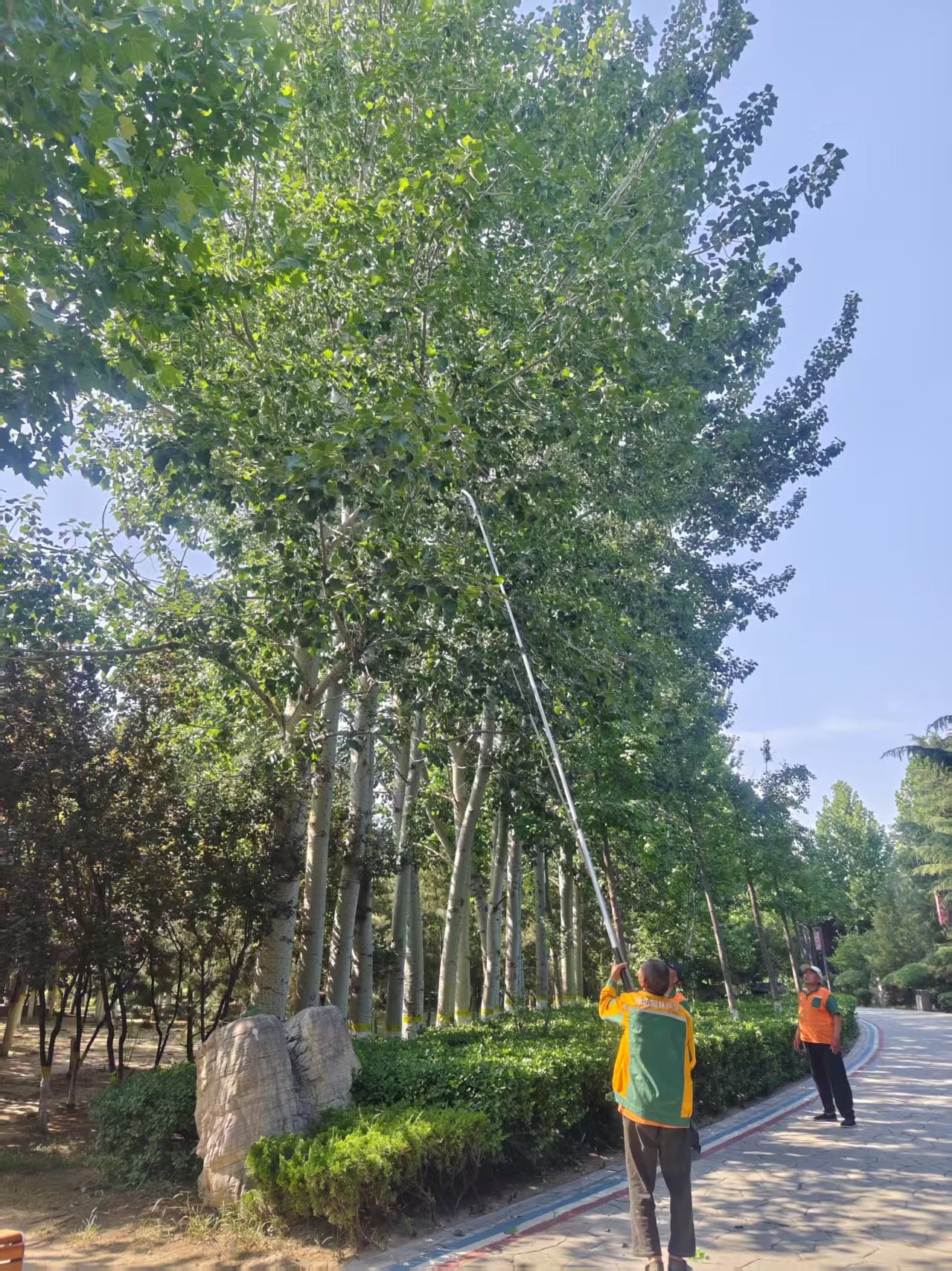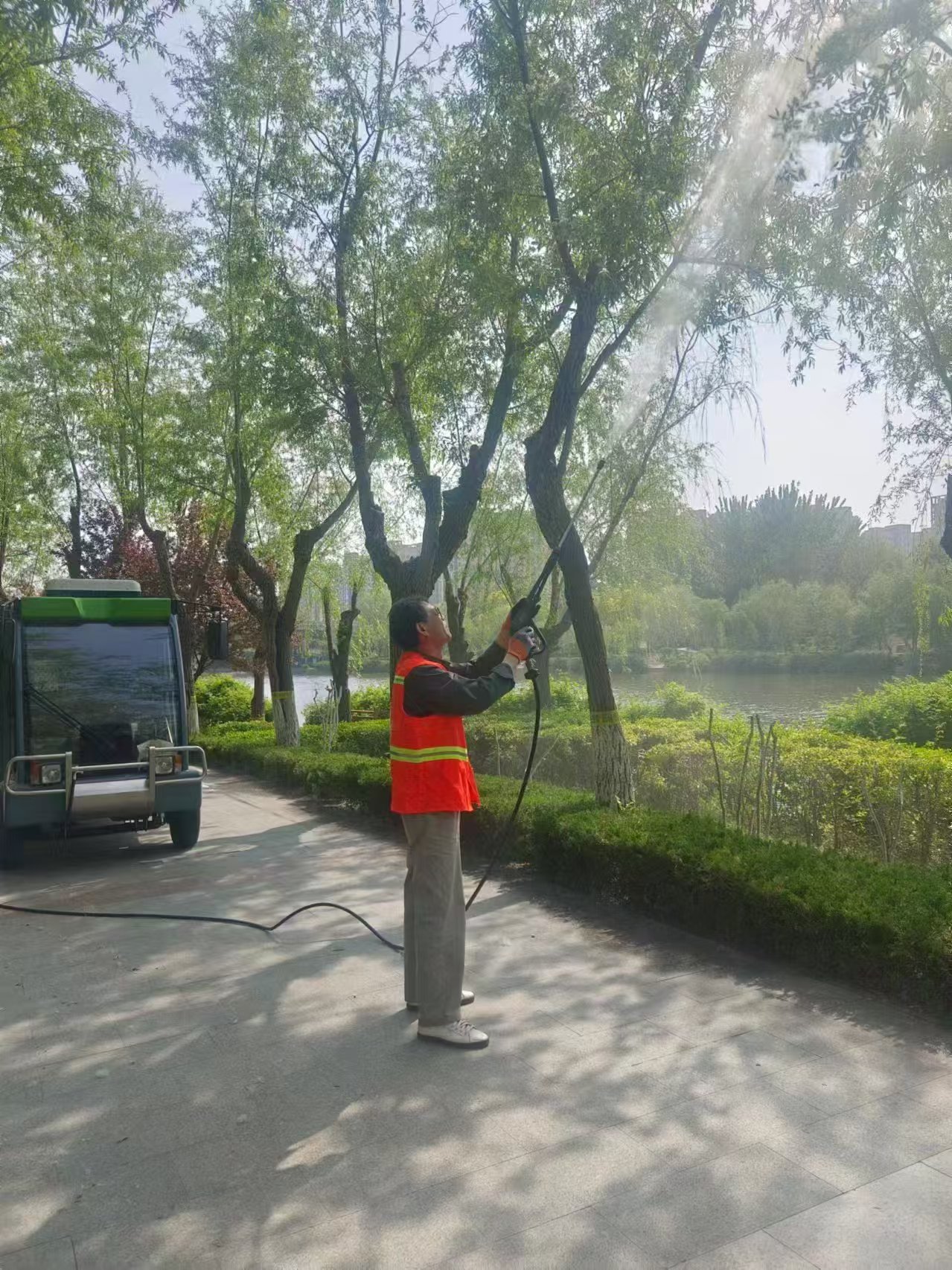 ?       楊柳樹作為常見的綠化樹種,在美化環境、固碳滯塵等方面發揮著重要作用。然而,楊柳樹雌株產生的飛絮確實會對人們的生活造成一定影響。為減少楊柳絮帶來的困擾,公司今年早謀劃、早行動,制定了詳細的防治方案。在具體防治措施上,堅持科學治理,優先對景區內楊柳樹過大過密的樹冠進行修剪,從源頭上減少飛絮產生。同時,在飛絮集中的時間段,延長景區內澆灌開啟時長,保持地面濕潤,安排專人利用沖洗車、打藥車、景區消防車對樹冠進行噴水作業,通過濕潤楊柳絮,使其加速沉降,避免再次隨風飄移。此外,為及時清理收集飄落的楊柳絮,公司增加了保潔人員和清掃頻次,采用人工清掃與機械清掃相結合的方式,對景區道路、廣場、綠化帶等區域進行全方位清理,并及時將收集的楊柳絮清運出景區,防止二次污染。